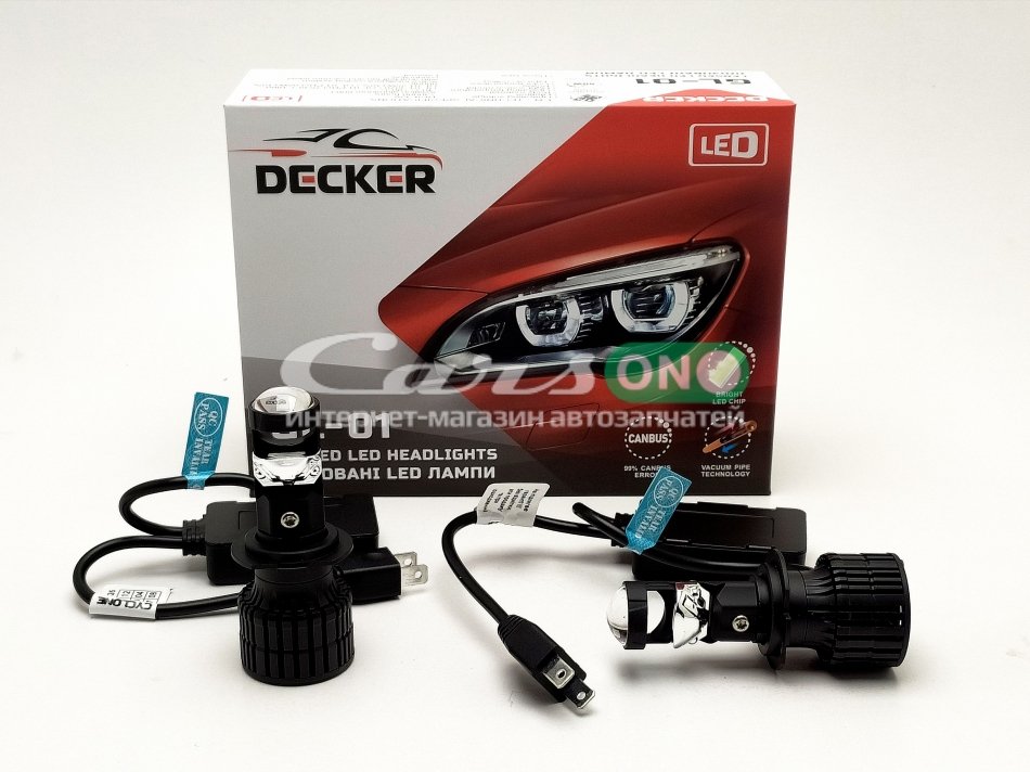 Лампа LED H7 12-24V с линзой 6000K 8000ЛМ 55В (к-т 2 шт) куллер+CAN-модуль DECKER Type H7